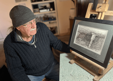 Artist and coal miner Rod Thackray was co-owner of Ludworth Moor Colliery which was on the Mellor border with Derbyshire. Its underground operations closed in 1981 and open cast in 1983. Rod had also spent years researching local coal mines and talking to and recording stories from old miners who had worked the pits around Mellor.